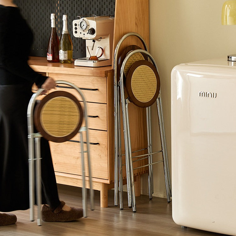 The Luma Folding Chair combines a woven rattan seat with a wood-framed surface and a clean steel structure. The materials are chosen for contrast—warm, textured, and breathable, set against a smooth, minimal frame.